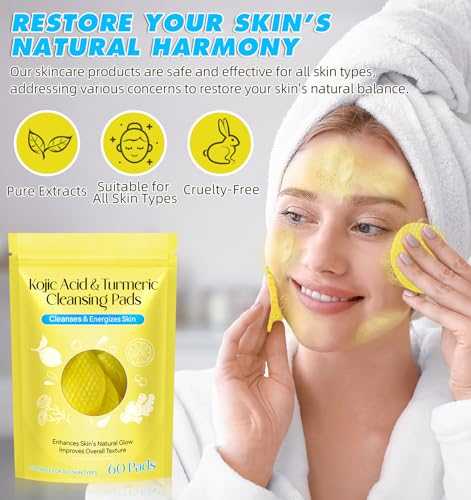 Turmeric Kojic Acid Cleansing Pads, 60 Count Turmeric and Kojic Acid Pads, Mild and Non-irritating, Suit for All Skin Types